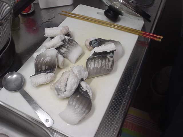 で、こいつを、思い切って頭と尻尾を切り捨てて、内臓を取り、軽く湯がいてから流水で水洗いをしてぬめりを取ります。